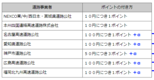 高速の会社によって付き方が異なりますが、関東周辺だと大体10円につき1ポイントです。