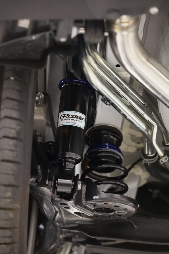 軽快な車両にパワーを上げ、そのパワーをしっかり路面に伝えるため足回りはストリートダンパーを採用。15段の減衰力調整機能も付属してあるため、走るステージに応じてのセッティングも可能です。なによりパワーアップにも負けない足回りでストリートから街乗りまで楽しめる仕様の車に仕上がりました。