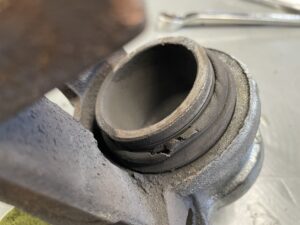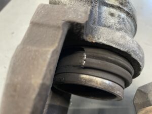 画像のようにダストブーツが熱で破れてきます。ブレーキパットの残量が少ない状態で走行するとピストンが飛び出てダストブーツも出てきますので熱を直接受けて破れてしまいます。