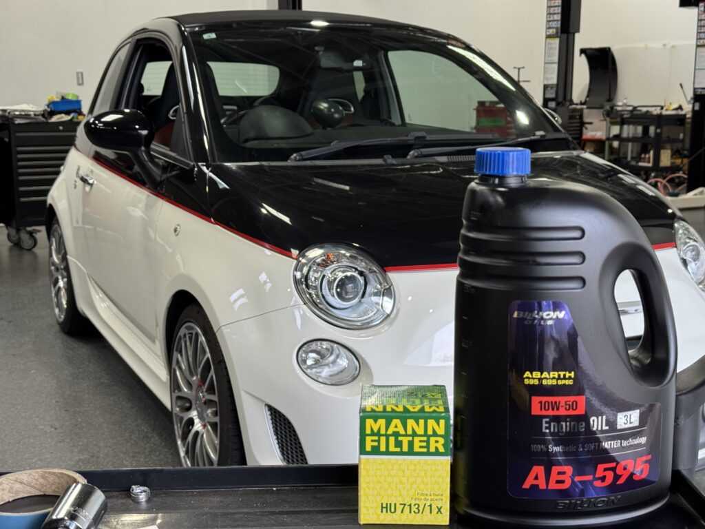ABARTH595Cでエンジンオイル・オイルフィルター交換作業で御来店頂きました。