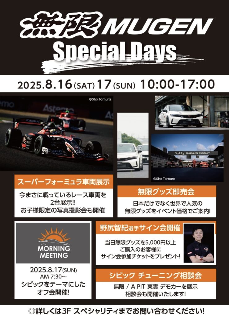 無限デモカーの展示、シビックチューニング相談会もありますのでご参加お待ちしております。
