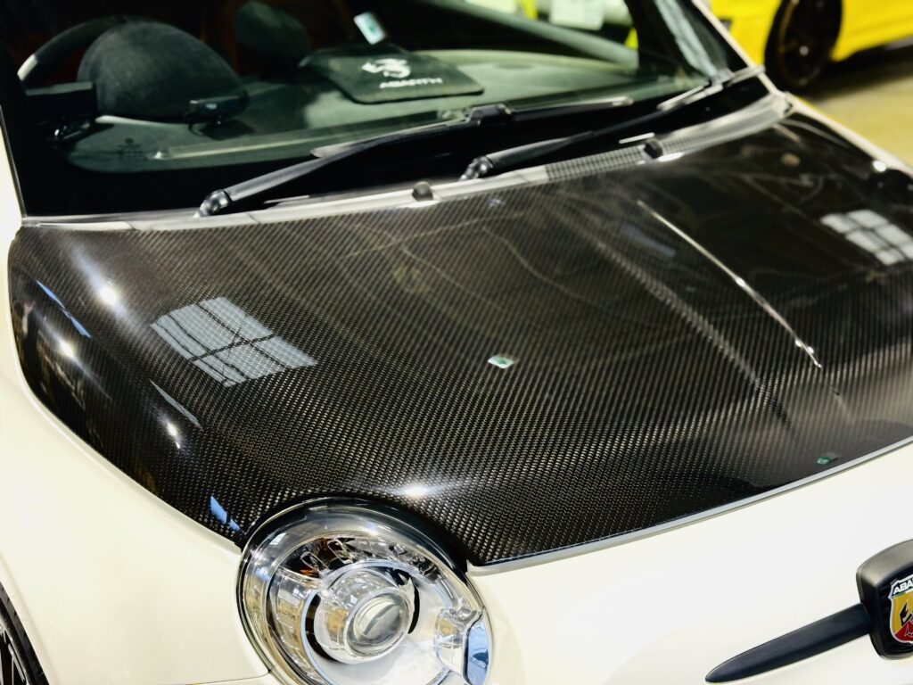 ABARTH595でOrqueドライカーボンボンネットに交換をしました。