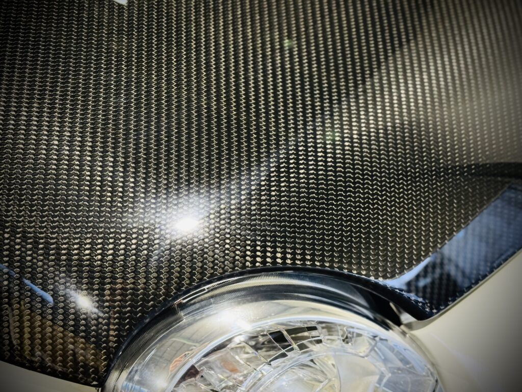 クリアー塗装がとても綺麗でピカピカに光っているのが画像でもお分かり頂けると思います。ドライカーボン製なので持ってみるとその軽さに驚きます。ボンネットを開ける時に指で持ち上げたくなる程です。