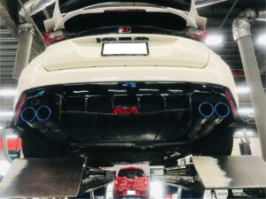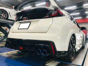 HONDAのFK2 シビックタイプRにfujituboのA-RM+cが取り付けられてましたが、出口の使用変更でカーボンテールから、TITANIUM FINISHER 焼色グラデーションに交換されました!テール部分の交換のみで、イメージ変更に大きく貢献してます。