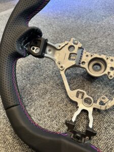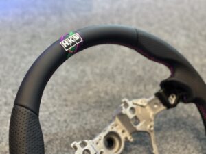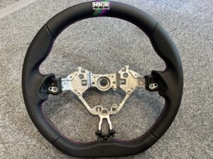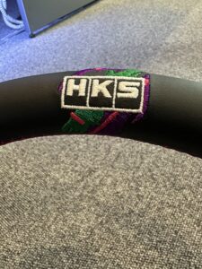 刺繍のHKSロゴを施した、置き換えステアリング。
