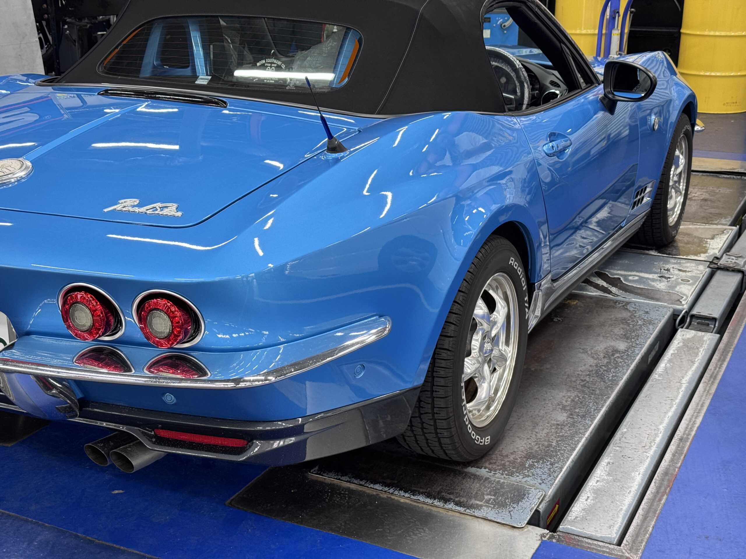 NDロードスターがベースになっておりデーターが無いので早速ピットへ入庫し検証させて貰いました。ボディーが大きくなってリヤバンパーが一体型でマフラーを外せばと思っていたら隙間から手が入るので直ぐに取付けに。
