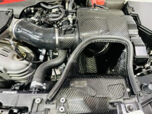 エアフィルターを遮熱性に優れたカーボン製エアボックスの中に設置し、吸気温度上昇によるパワーロスを防ぎます。ブラックカーボンが、エンジンルームのドレスアップにもつながりました。
