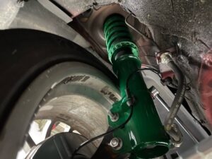 今回はフロントのタイヤサイズを変更されてましたのでタイヤ外径に合わせて車高調整と少しスポーツ走行もされるためキャンバーボルトを追加させていただきフロントのキャンバーをネガ方向に調整させていただきました。