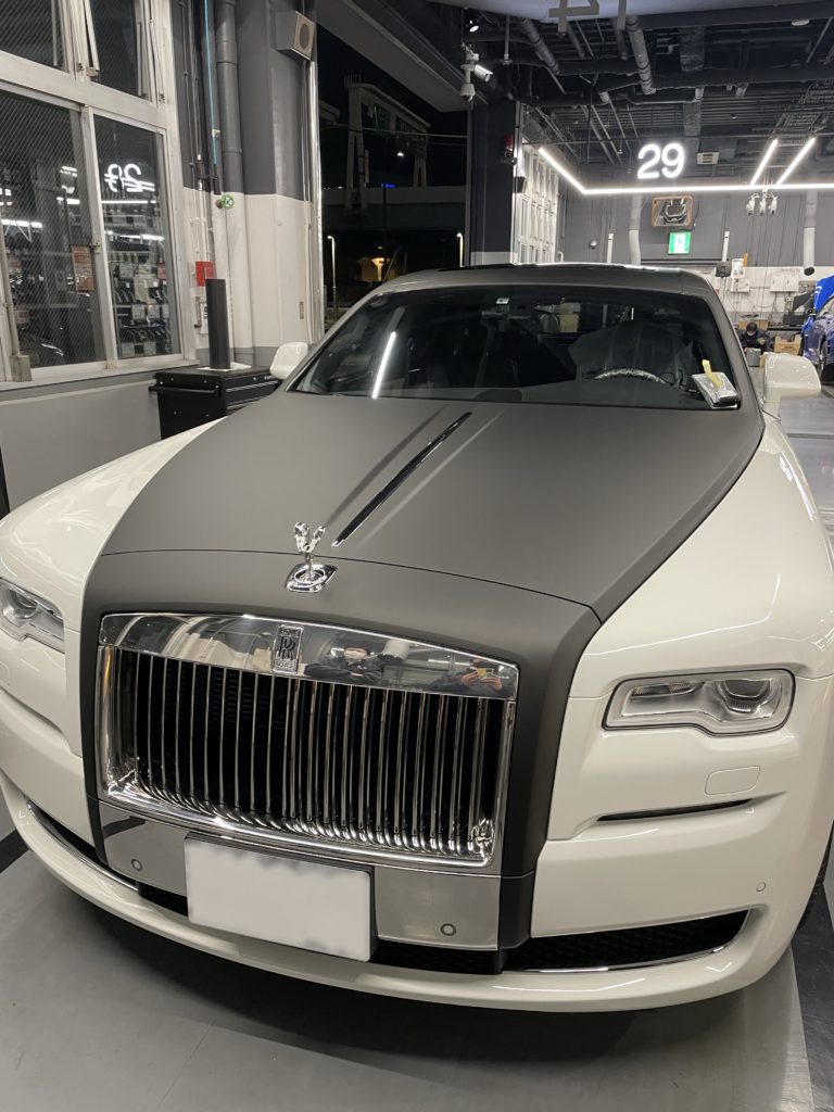 ロールスロイスGHOSTにラッピングさせて頂きました。マットブラックのラッピングを追加して流行りのツートン仕様に かなり迫力が増しました