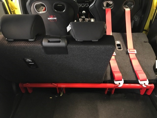リアシートを倒せば4点シートベルトの肩ベルトフックを取り付けできます。