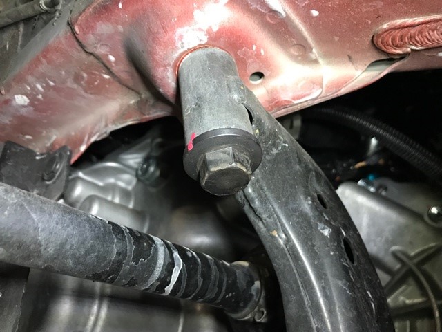 フロントサブフレームとボディを取り付けするボルト部分ですがサブフレームの取り付け部とボルトに画像とうり隙間があります。
