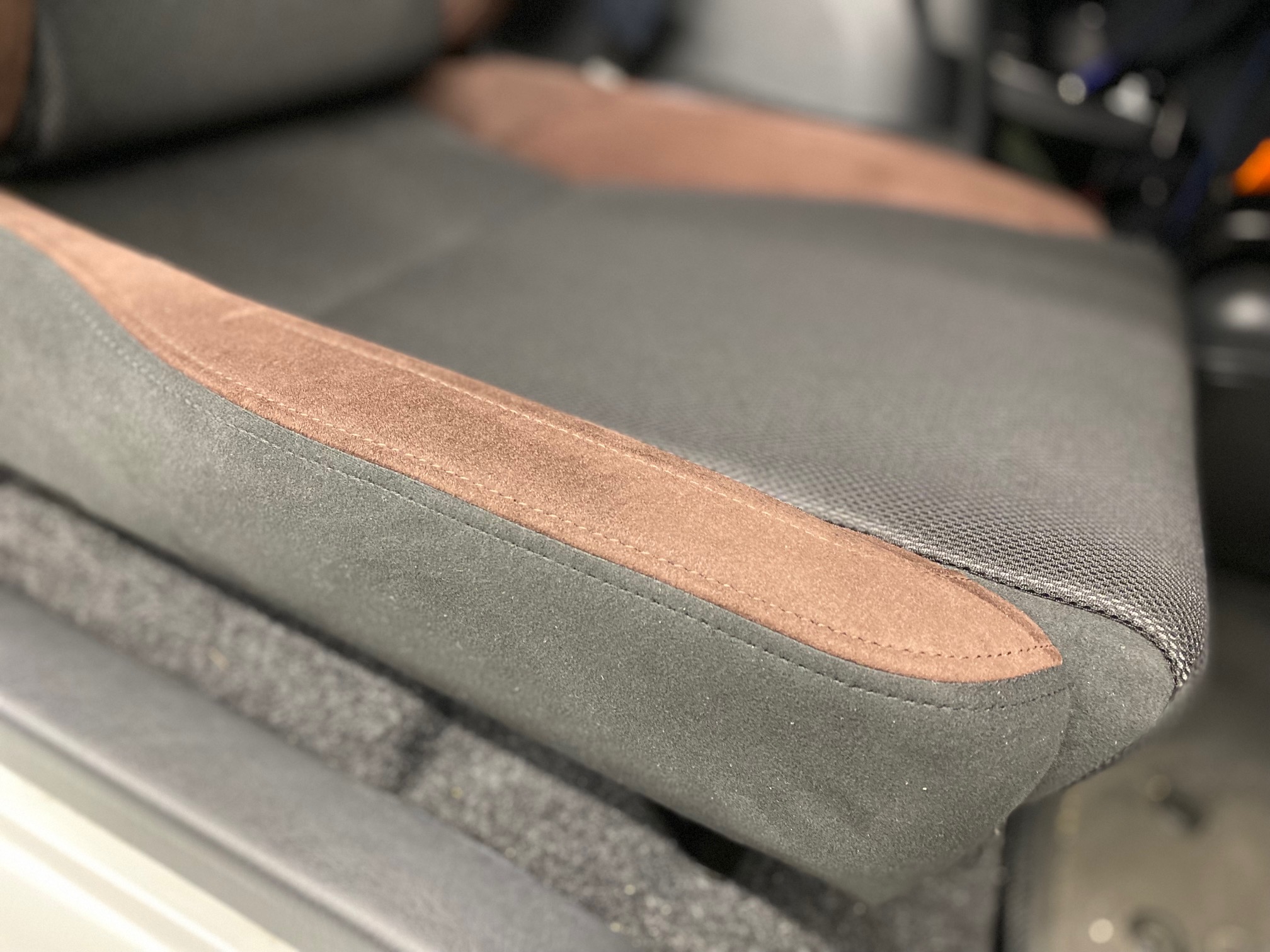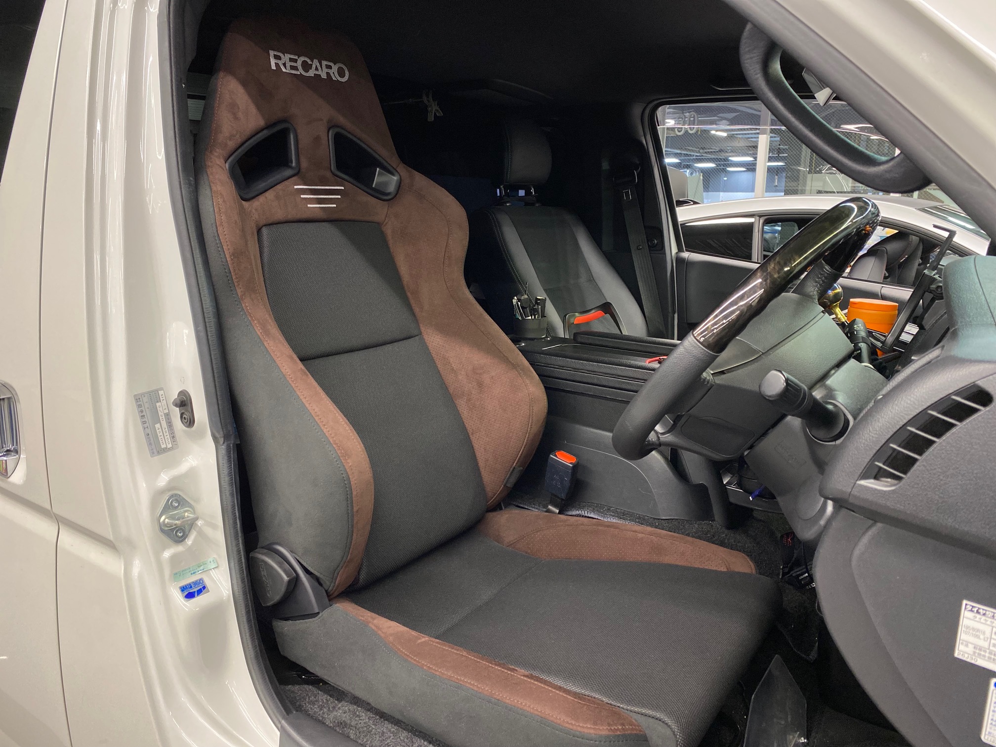 数ある試座シートの中でハイエースでのマッチングとあわせSR-7Fを装着させていただきました。今回はハイエースだけでなく他の車種でも人気カラー「BROWN」です。GUのREDで車内にアクセントを入れるものいいですが、BROWNで全体的に落ち着いたイメージの車に仕上げるもよし。レカロシートはロングドライブだけではなくドレスアップパーツとしてもお勧めです。今回はハイエースのベースフレーム在庫があったため、即日取付させていただきました。このように在庫、ピット作業とのタイミングがあえば即日取付も可能ですので是非当店へご相談ください。