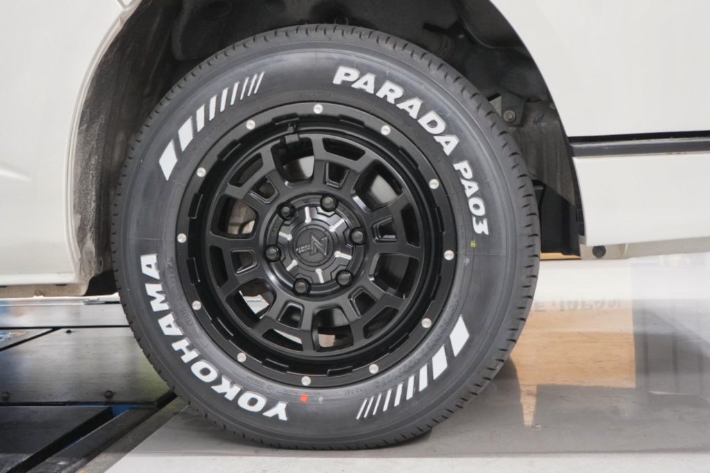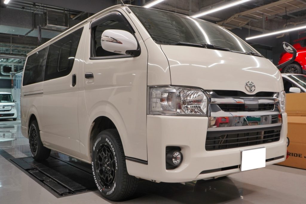 ハイエースにタイヤホイールとオーリンズショックを取りつけました。