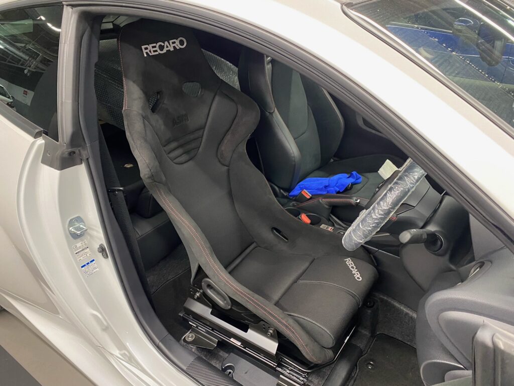 ブラックウルトラスエード×赤ステッチが画像を通してもハッキリとしておりお客様も大変満足いただきました。GRヤリス、カローラスポーツのRECARO製ベースフレームは常時在庫しておりタイミングによっては即日取付も承っております。
