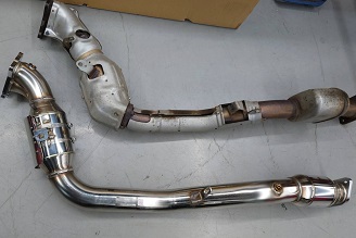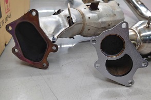 純正のフロントパイプと比べるとHKS製はタービン通過後の排気を効率よく排出させる構造が目を引きます。