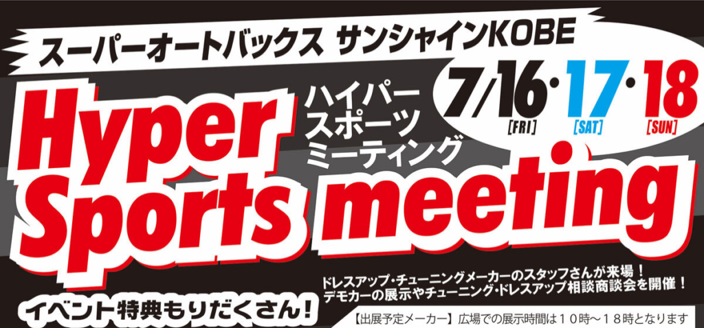 7月16,17,18日の3日間スーパーオートバックスサンシャイン神戸で開催されるハイパースポーツミ...