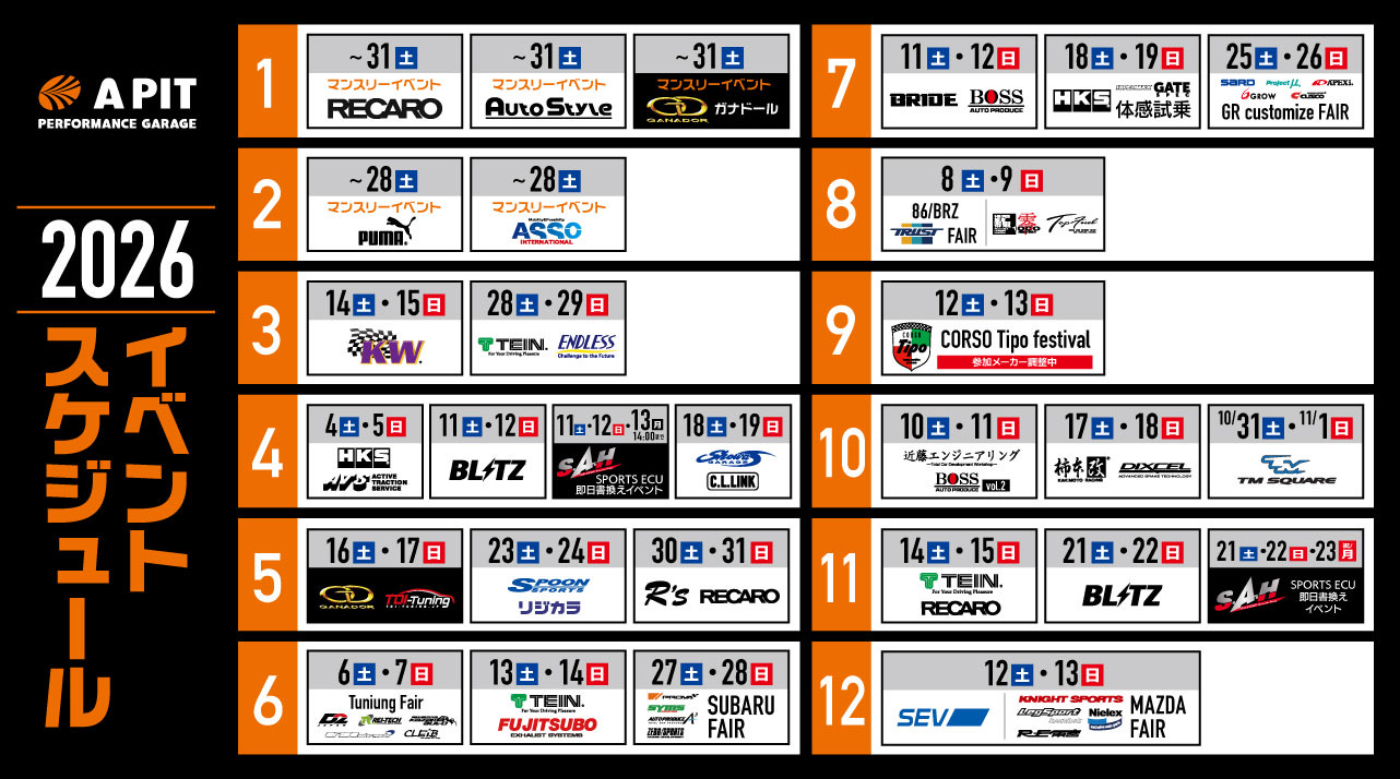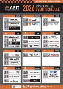 OTHER EVENTSその他イベント新着情報 2026/04/01 - 2026/05/31 RECARO ASM limited キャンペーン! PERFORMANCE GARAGE東福岡 コーナーイベント APIT PERFORMANCE GARAGE東福岡ASMRECARO 2026/04/18 - 2026/04/19 【ジムニー/シエラ/ノマドFAIR】 PERFORMANCE GARAGE東福岡 コーナーイベント APIT PERFORMANCE GARAGE東福岡CLリンクSHOWAガレージ 2026/04/05 - 2026/04/05 PERFORMANCE GARAGE東福岡 コーナーイベント 86/BRZ スタイルAPIT PERFORMANCE GARAGE東福岡オートポリス VIEW MORE