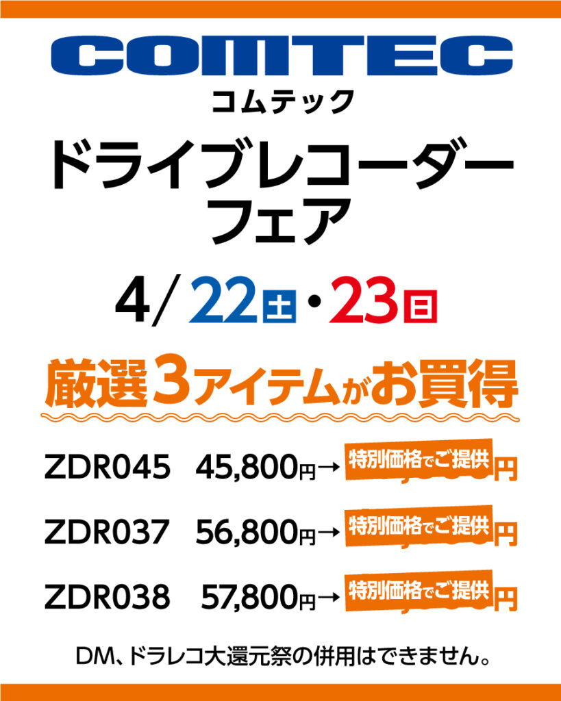 4月22日(土)、23日(日)はコムテックドライブレコーダーがお得!