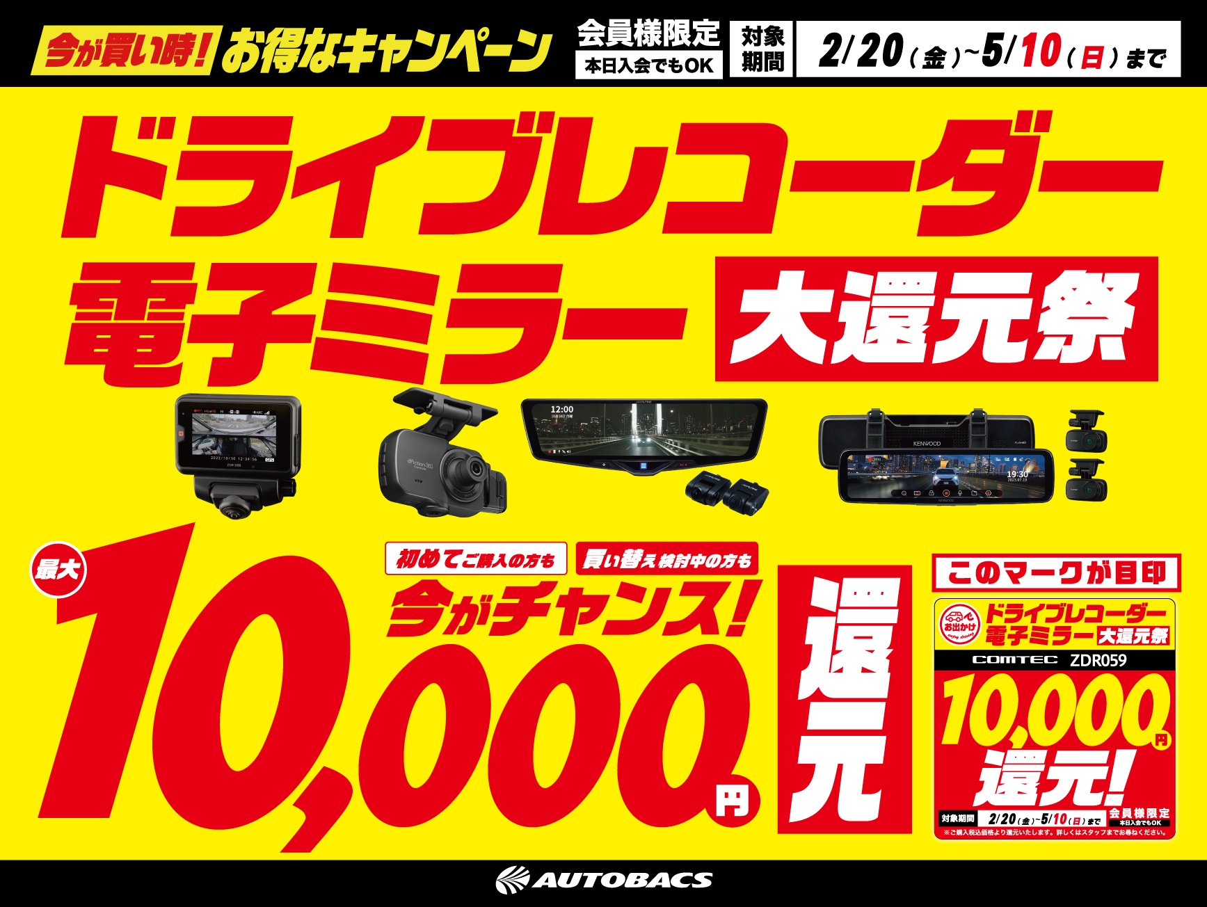ドライブレコーダー・電子ミラー大還元祭を2月20日(金)~5月10日(日)の間、店内3階ドライブレコーダーコーナーにて開催致します。