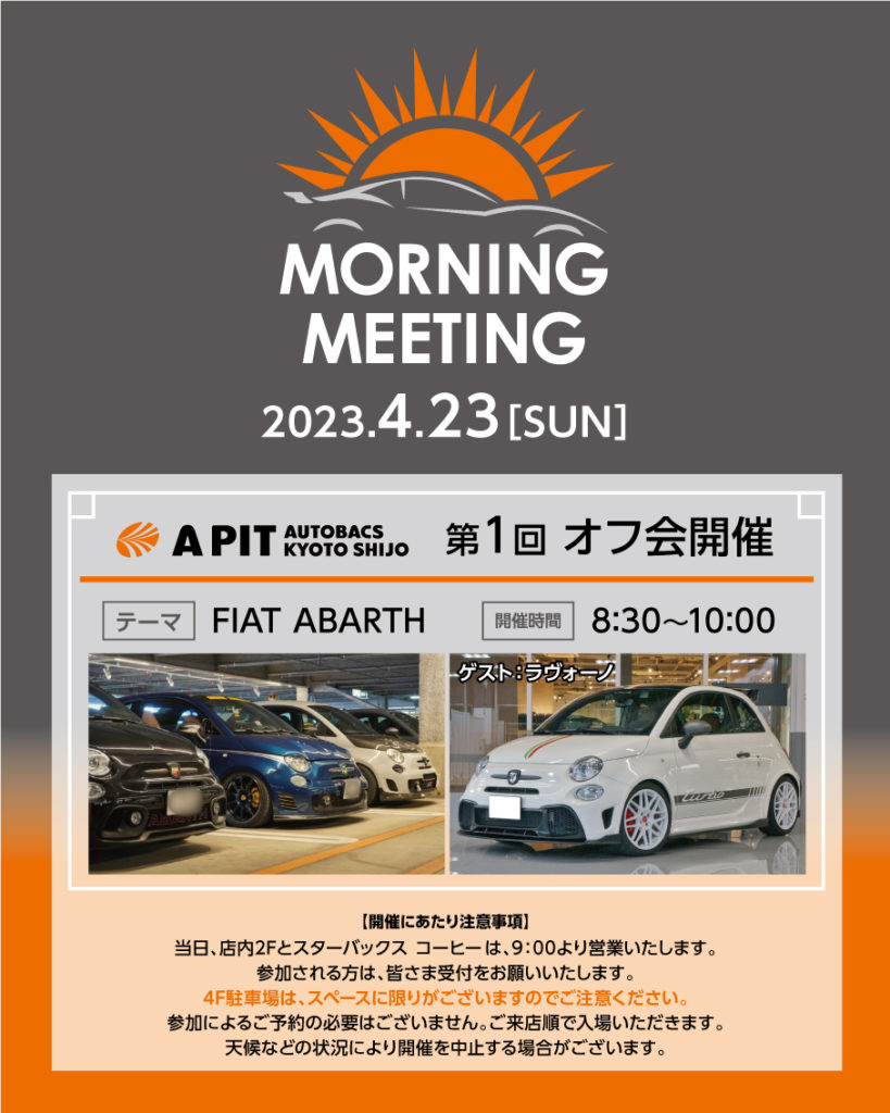 4月23日(日)8:30よりAPIT京都四条4階駐車場にて朝のオフ会『MORNING MEETING』を開催します!