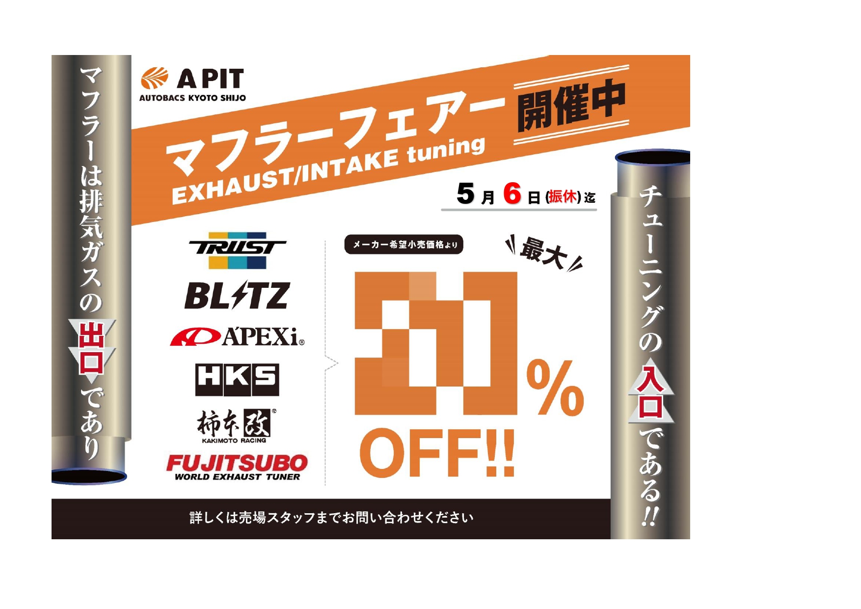2階スポーツコーナーではマフラーフェアを開催中です。 ドレスアップ、チューニングはマフラーから! ...