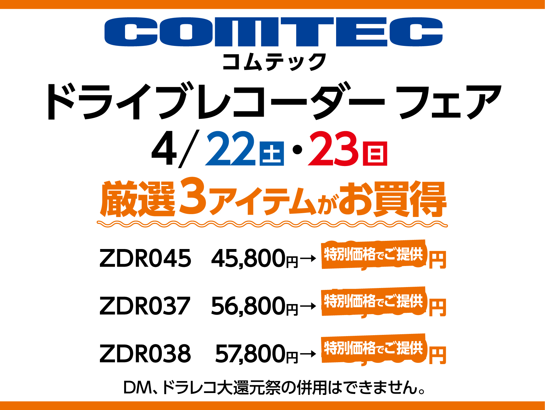 4月22日(土)、23日(日)はコムテックドライブレコーダーがお得! 厳選3アイテムが2日限りのお買...