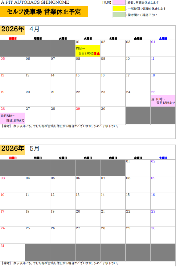 OTHER NEWSその他ニュース 2026/04/17 【A PIT東雲】セルフ洗車一時休止のお知らせ セルフ洗車場を一時休止いたします。 ※お知らせ※ APIT東雲 APIT東雲セルフ洗車 2026/03/31 【HKS GATE TOKYO BAY】 2026年4月度H... HKS GATE TOKYO BAY でのHKSスタッフ在店スケジュールのご案内です。 詳しくはス... ※お知らせ※ 東雲店 HKSHKS GATE 2026/03/30 4月度【 PERFORMANCE FACTORY】営業日のご... 4月度【 PERFORMANCE FACTORY】営業日のご案内 ※お知らせ※ PERFORMANCE FACTORY PERFORMANCE FACTORY VIEW MORE
