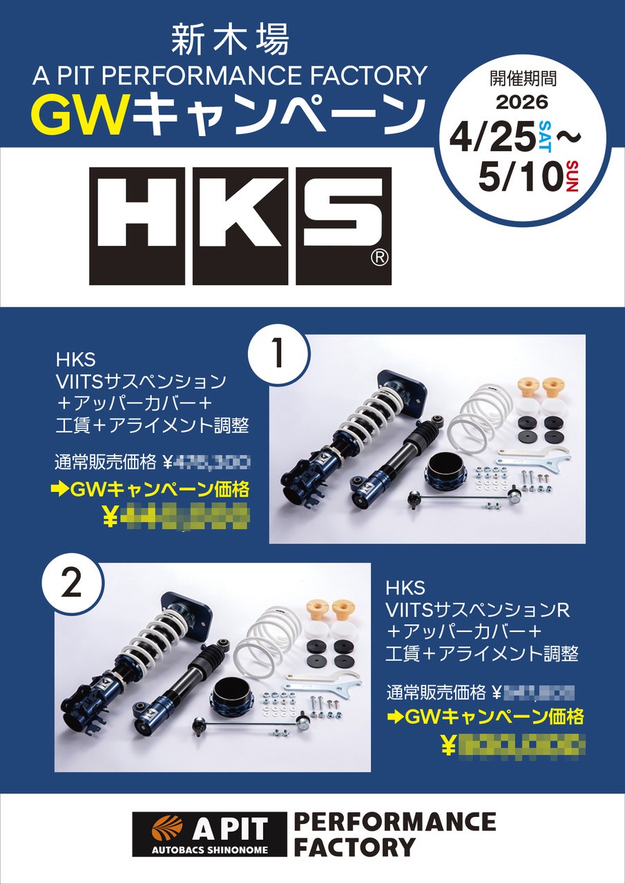 APIT PERFORMANCE FACTORYでは2026年4月25日~5月10日までHKS VIITSサスペンションキャンペーン開催します。