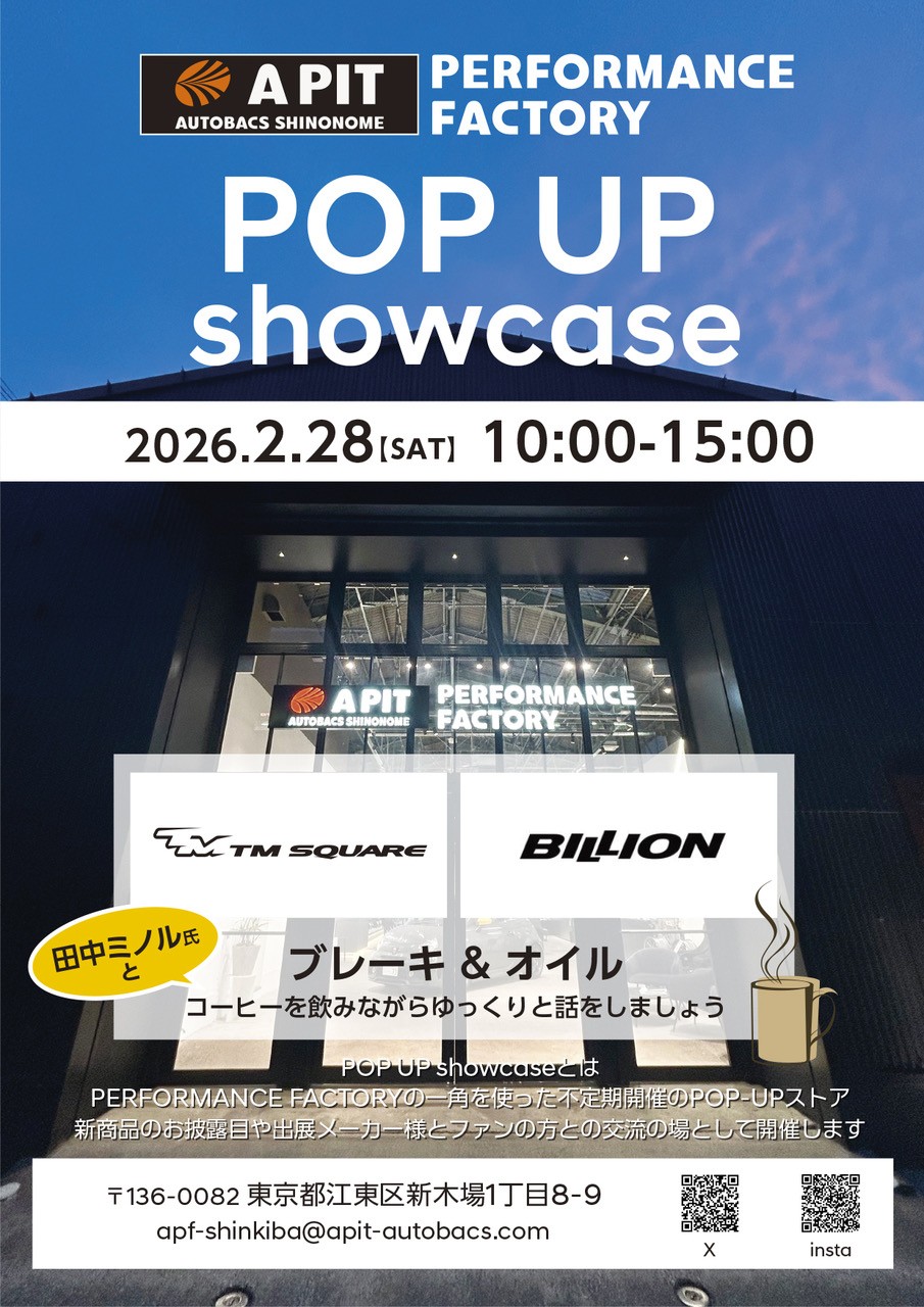 OTHER EVENTSその他イベント新着情報 2026/02/21 - 2026/03/30 【新木場】PERFORMANCEFACTORY マンスリーキ... 【新木場】 2月21日(土)~3月30日(月) サスペンションと同時購入でお買い得キャンペーン コーナーイベント ABARTHASSOアバルト車高調 2026/01/04 - 2026/01/31 【新木場】PERFORMANCEFACTORY WINTER... 新木場のPERFORMANCE FACTORで開催 コーナーイベント APIT PERFOMANCE FACTORYTEINZC33Sスイフトスポーツ 2025/12/13 - 2026/01/31 【新木場】PERFORMANCEFACTORY WINTER... 【新木場】HKS VIITSサスペンションがコミコミ価格でお買い得 コーナーイベント ABARTHAPIT PERFOMANCE FACTORYHKSアバルト VIEW MORE
