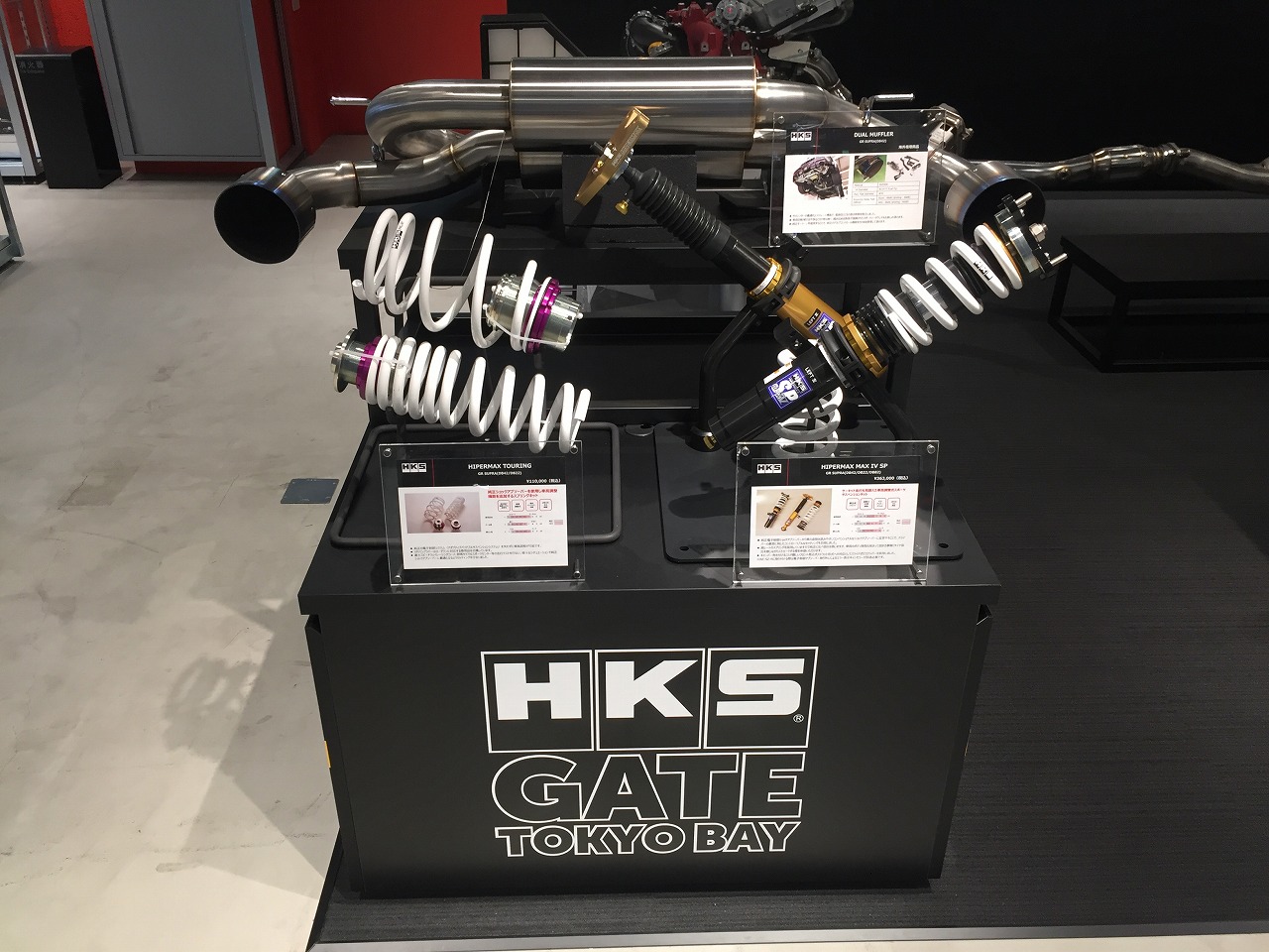 マフラー、メタルキャラタイザー、HIPERMAXシリーズなど、HKSの人気アイテムを多数展示しています。