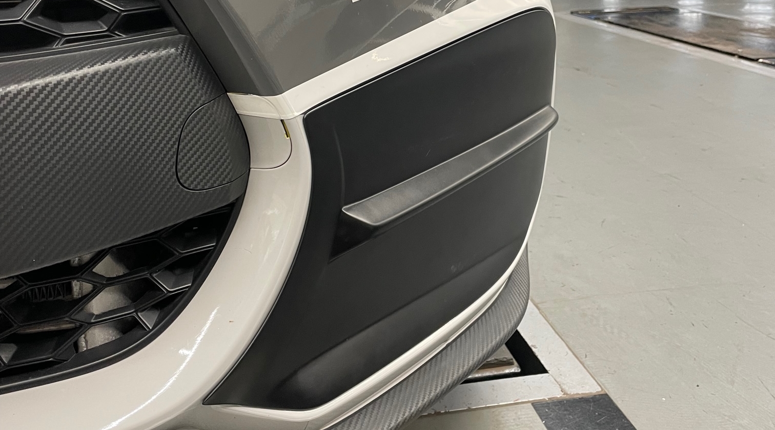 フロントホイールアーチのベンチレーションとエンジンルーム内のベンチレーションを両立させ、純正比8mmのワイドフェンダー FRP製 上部ダクト部はカーボン製 サイドフィンは表面カーボン製
