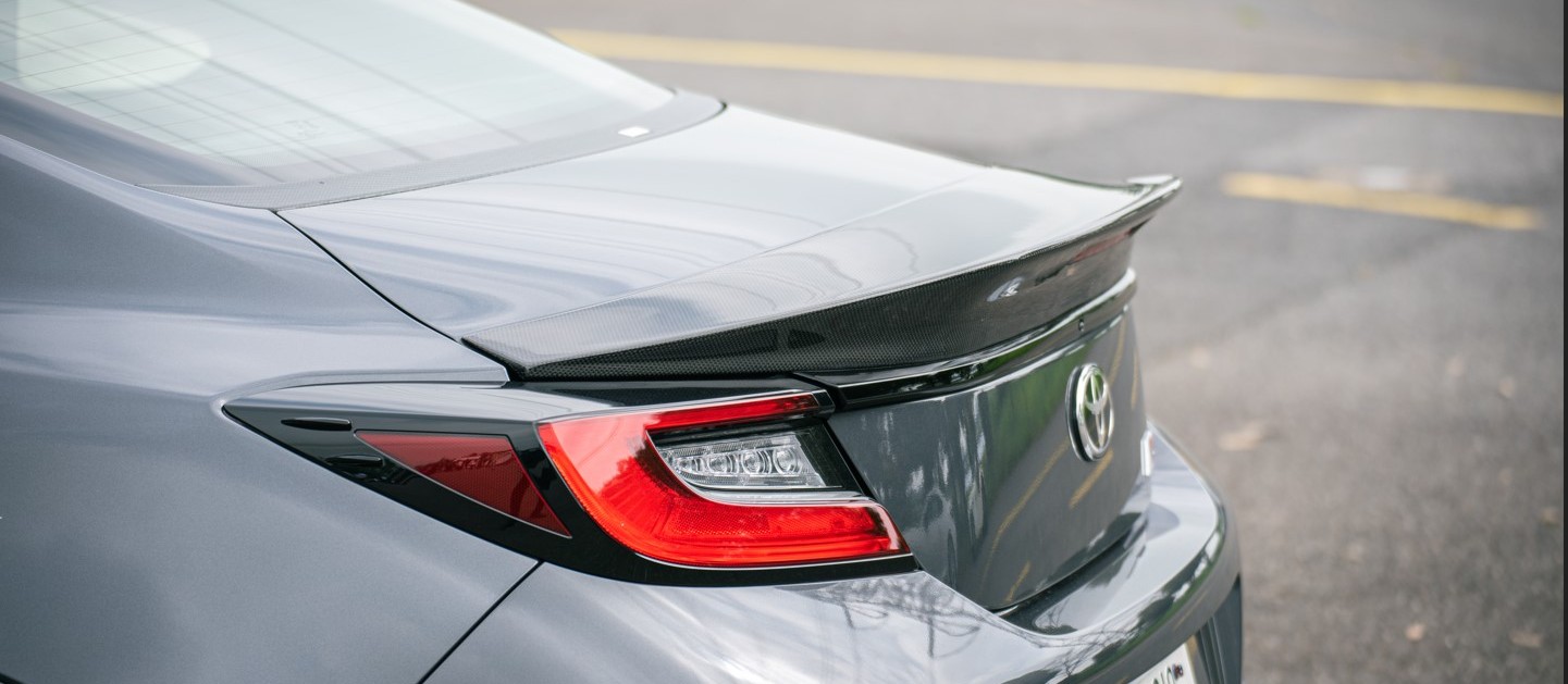 純正リアスポイラーの上部に張り付けてダウンフォースを向上させるリアルカーボンのエアロパーツ。